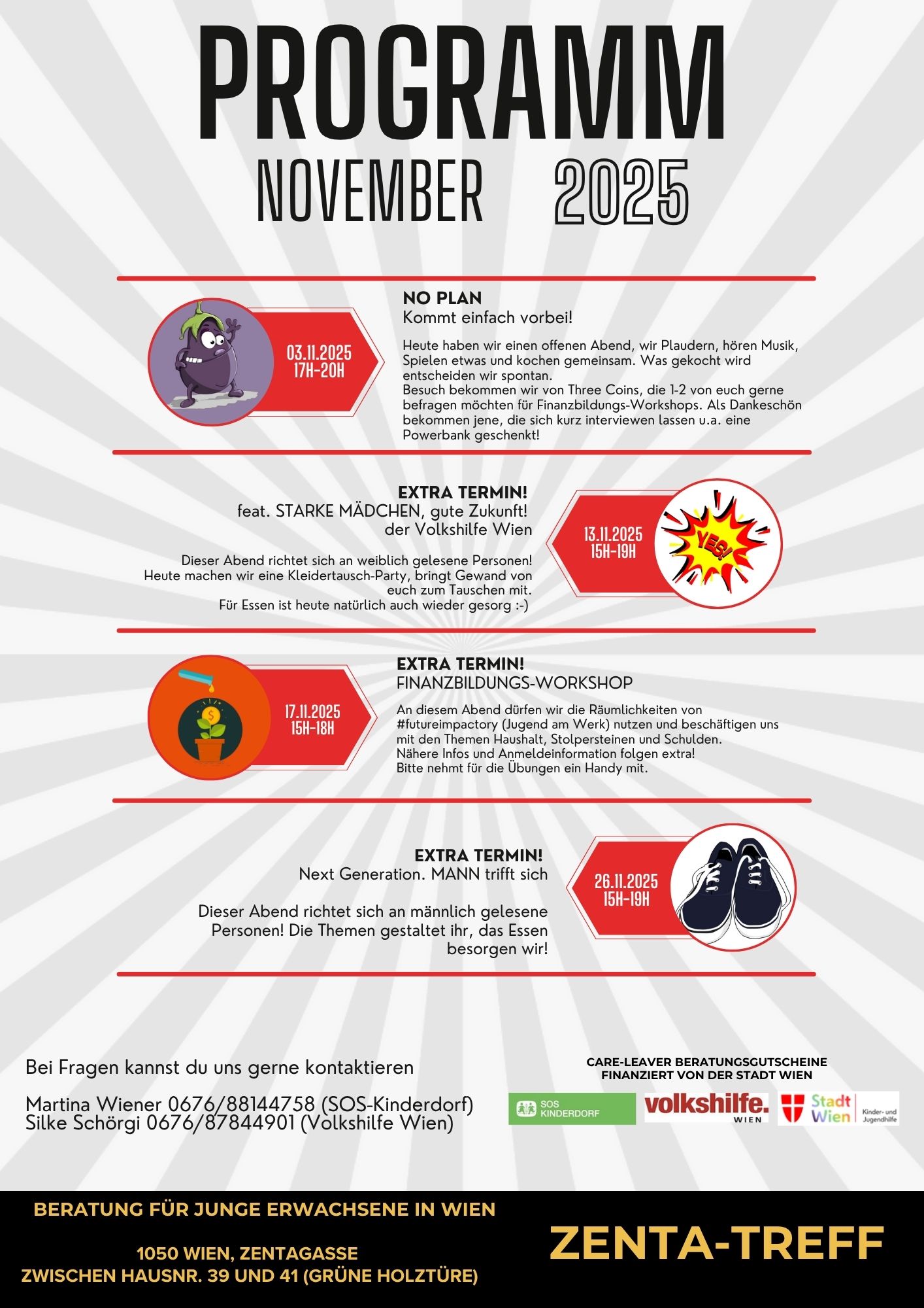 3.11.2025 von 17-19h, Zentagasse: "No Plan" Wir bekommen Besuch von Three Coins, die mit Freiwilligen von euch ein Interview machen wollen, wie man junge Menschen für Geldthemen begeistern kann. Als Dankeschön für jene, die mitmachen wollen gibt es Goodie Bag mit Powerbank und anderen praktischen Extras