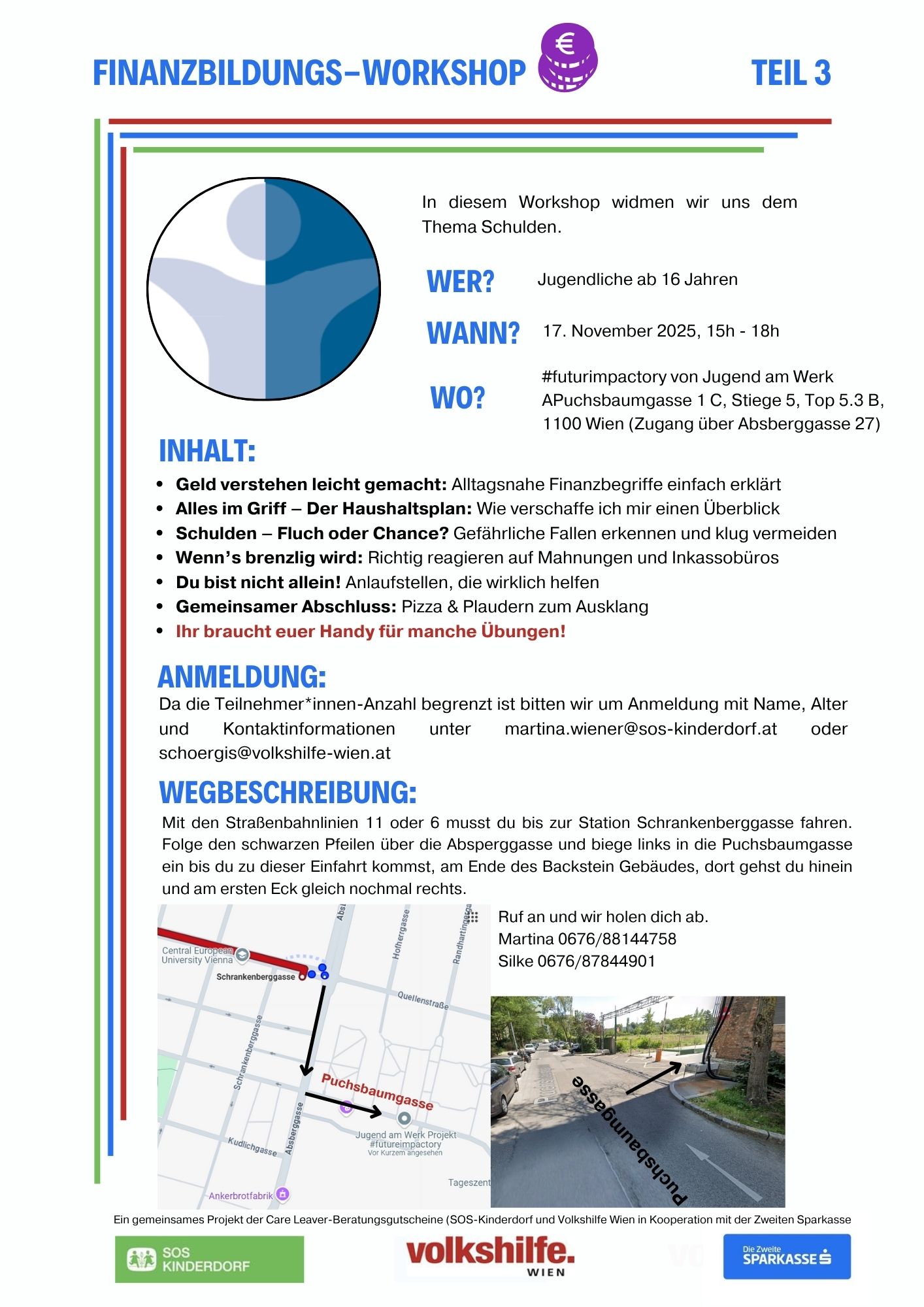 17.11.2025 von 15-18h: Finanzbildungsworkshop bei #futureimpactory. Im Anhang findet ihr den Inhalt des Workshops, sowie eine Wegbeschreibung zur Brotfabrik im 10. Wir treffen uns um 14h45 an dem Eck (Bild im Anhang). Bitte um Anmeldung bei Silke oder mir mit Name, Alter und Handynummer. Bitte Handys mitnehmen, die brauchen wir für eine Übung.